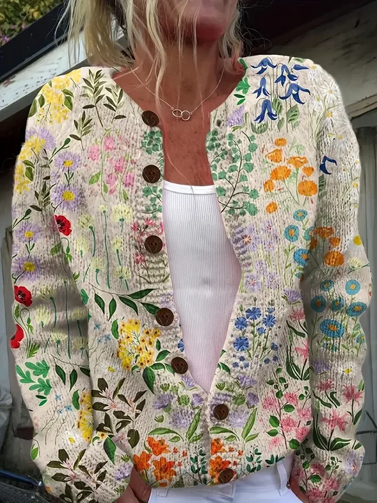 Women Floral Summer Dress Crew Neck Long Sleeve H-Line Dress
