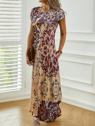 Women Ethnic Crew Neck Short Sleeve Comfy Casual Mini Dress