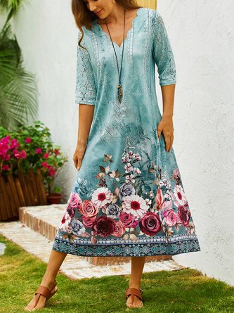 Women Floral Pattern V Neck Three Quarter Sleeve Comfy Vacation Maxi Dress