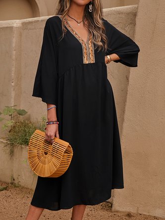 Women Plain Crew Neck Half Sleeve Comfy Elegant Embroidery Midi Dress