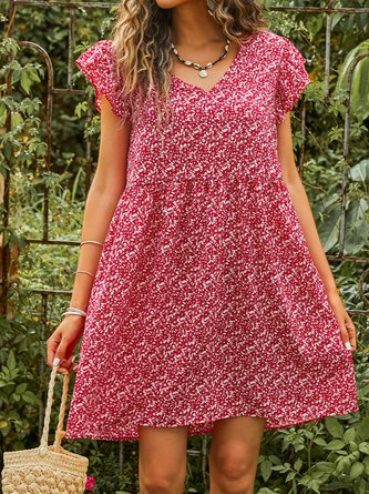 Women Floral V Neck Half Sleeve Comfy Casual Printing Mini Dress