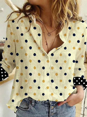 V Neck Short Sleeve Polka Dots Printing Regular Micro-Elasticity Regular Fit Button Up Shirt Shirt For Women