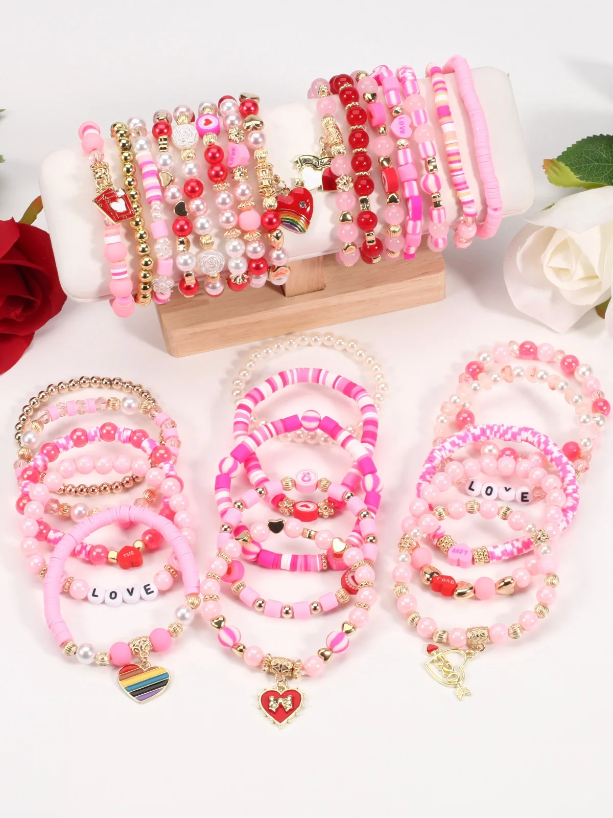 Bowknot Red Rhinestone Heart Valentine's Day Polymer Clay And Artificial Crystal Spliced ​​multi-layer Elastic Bracelet A Perfect Gift For Best Friends