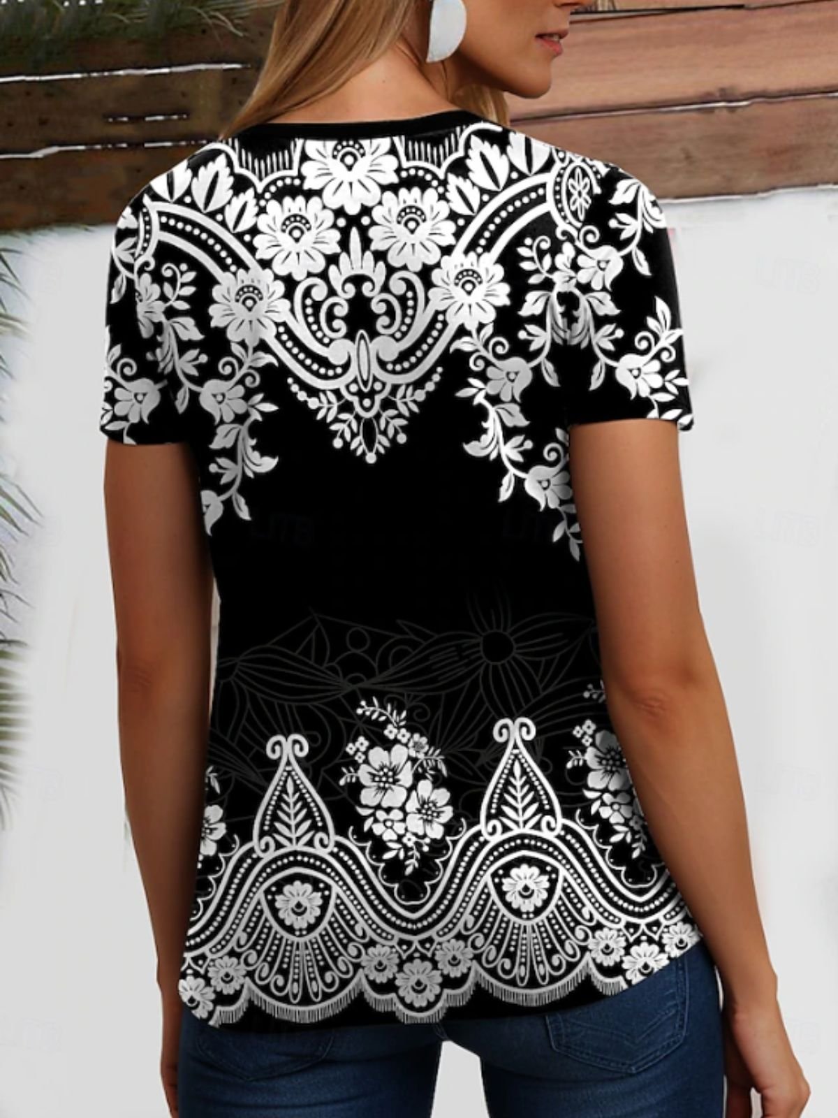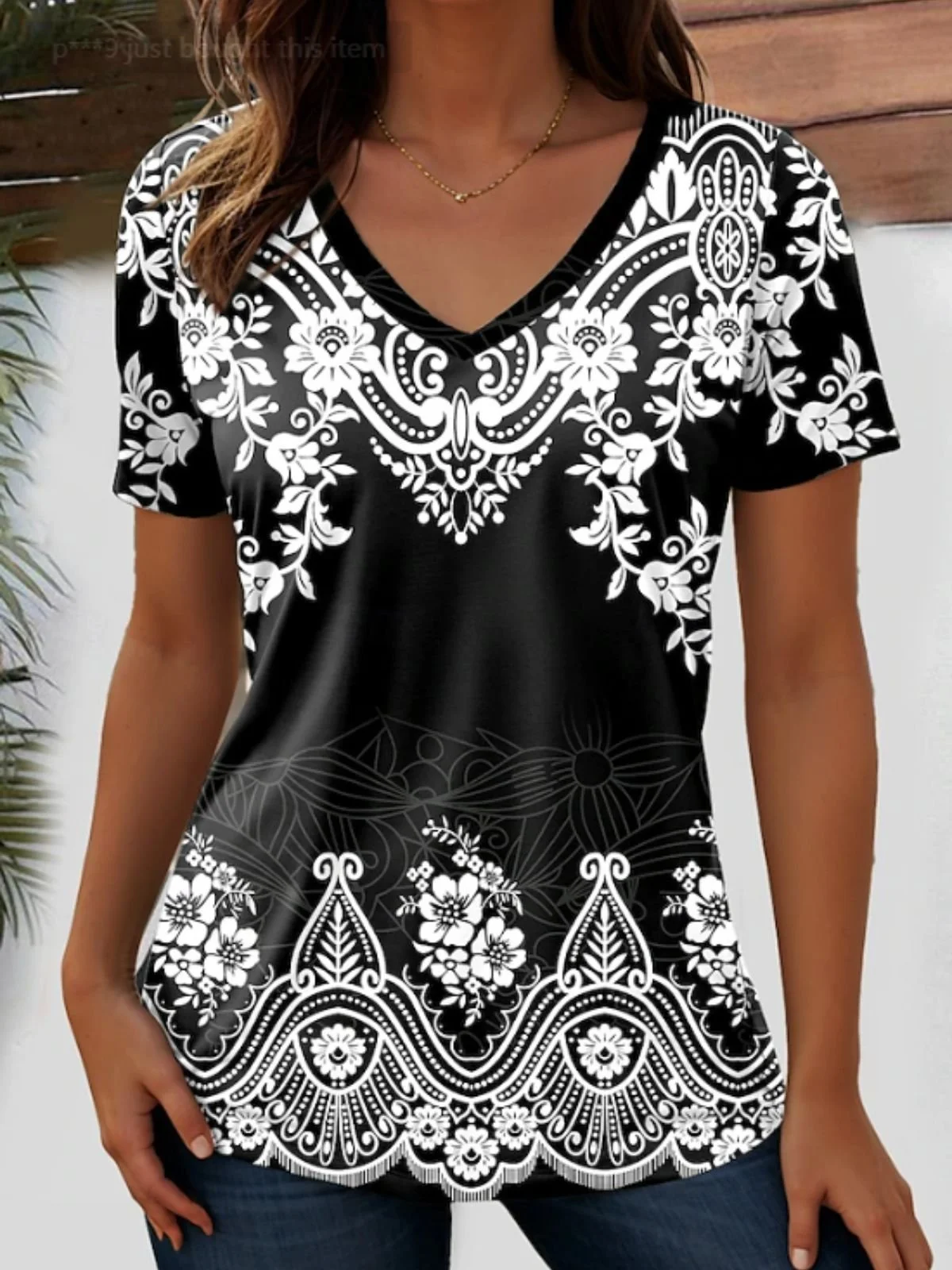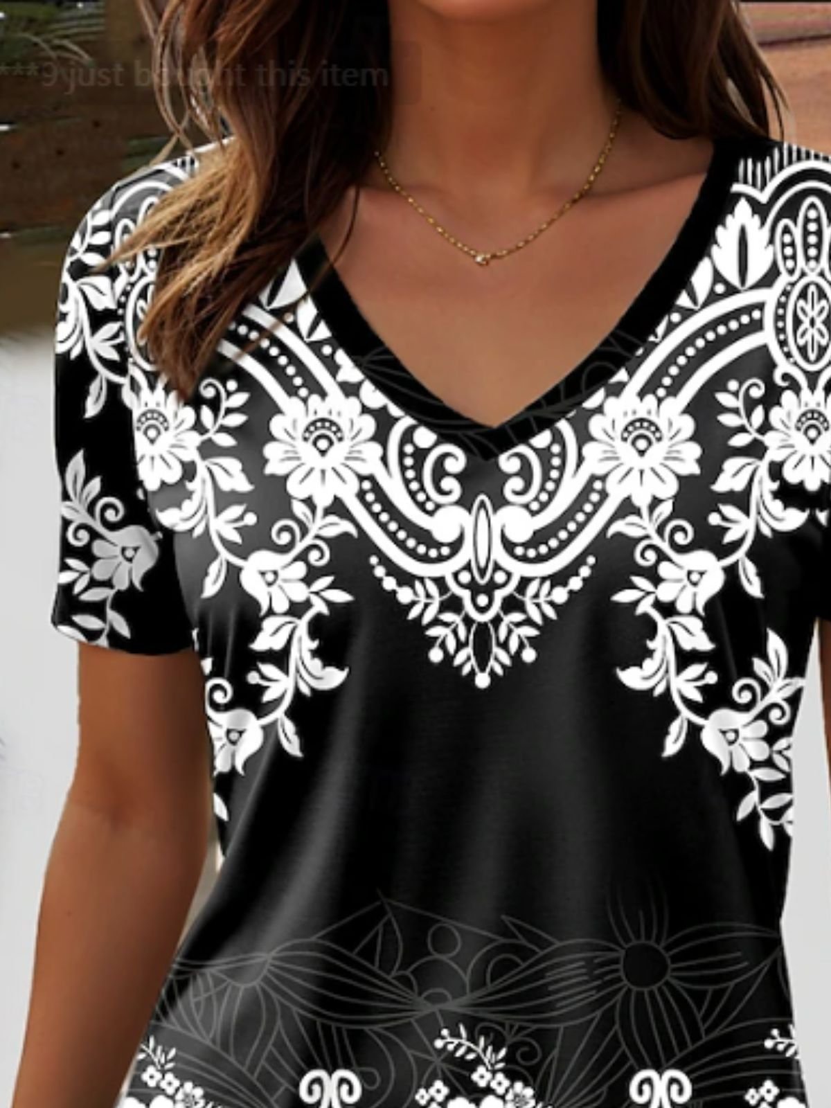 Casual Ethnic Print V Neck Short Sleeve T-shirt