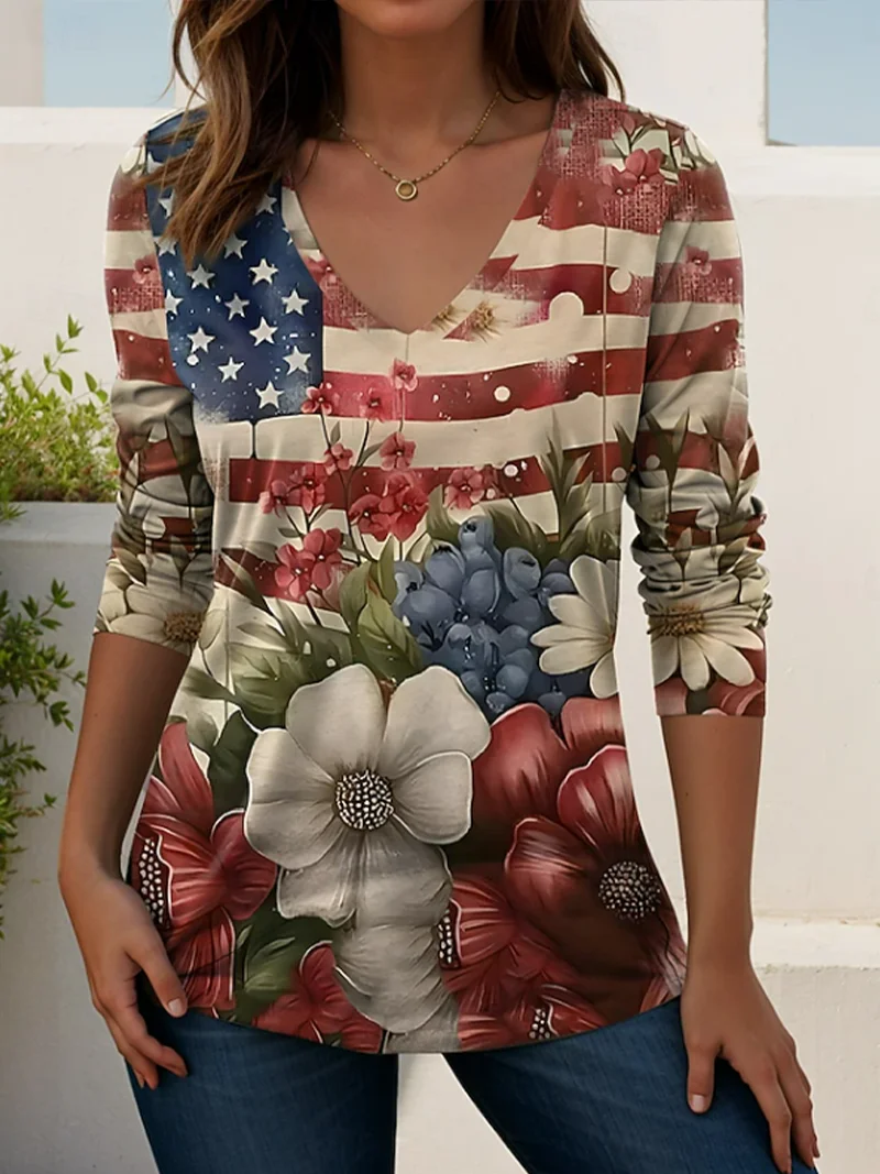Casual Floral V Neck Long Sleeve T-shirt