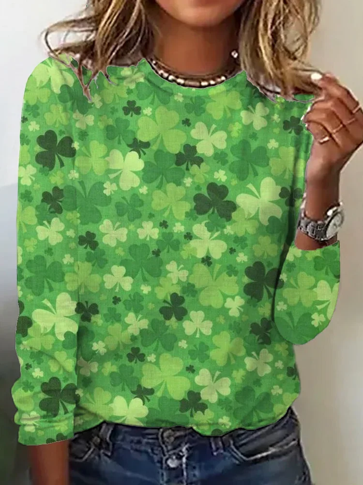 Casual Shamrock Crew Neck Long Sleeve T-shirt