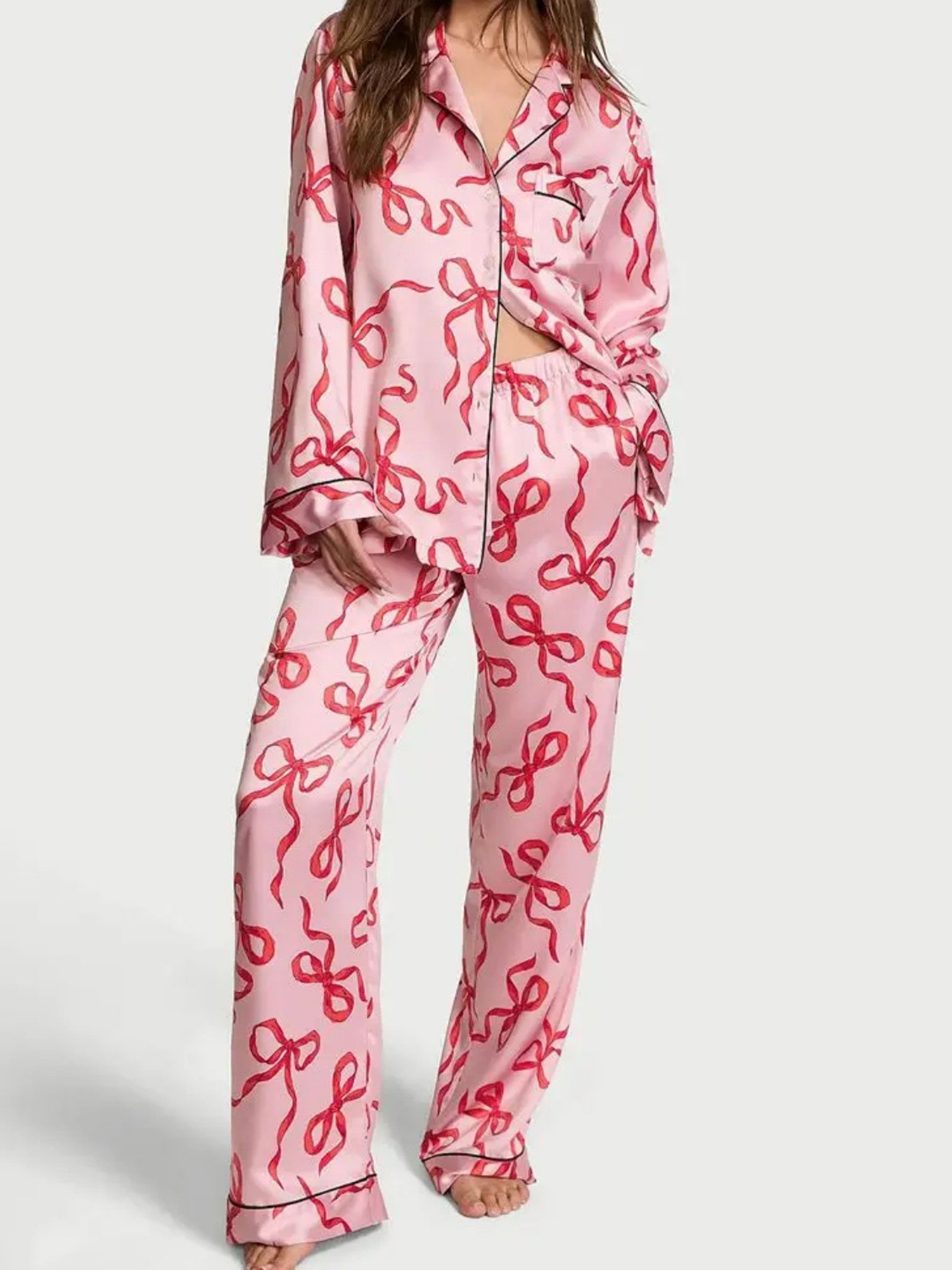 Casual Shawl Collar 3D Printing Bow Print Long Sleeve Shirt With Pants Pajama Set