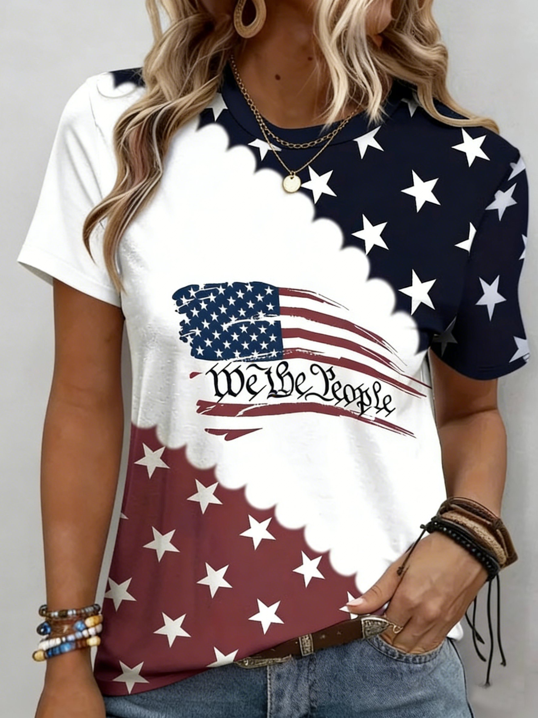Casual America Flag Star Print Crew Neck Short Sleeve T-shirt