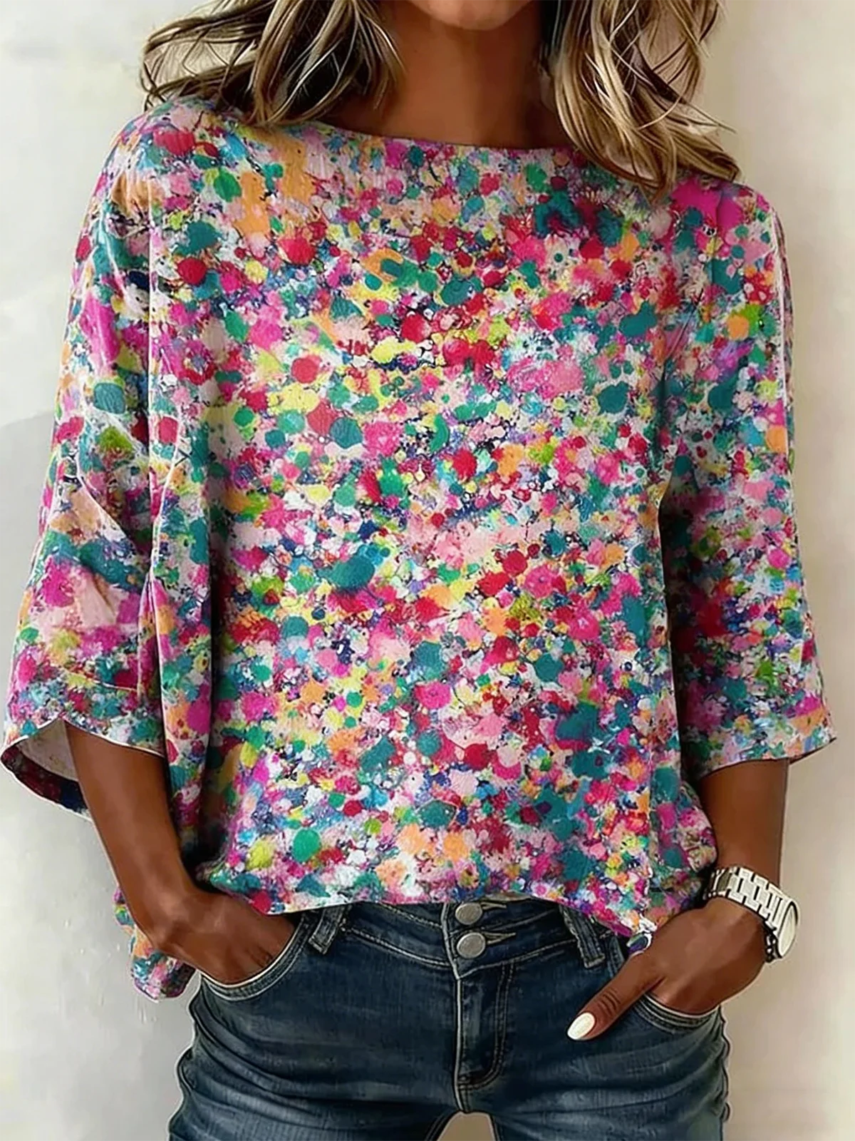 Crew Neck Half Sleeve Abstract Polka Dots Lightweight Loose Shirt For Women