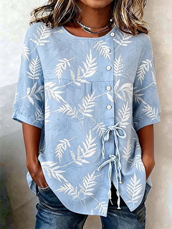 Crew Neck Half Sleeve Floral Regular Loose Blouse For Women