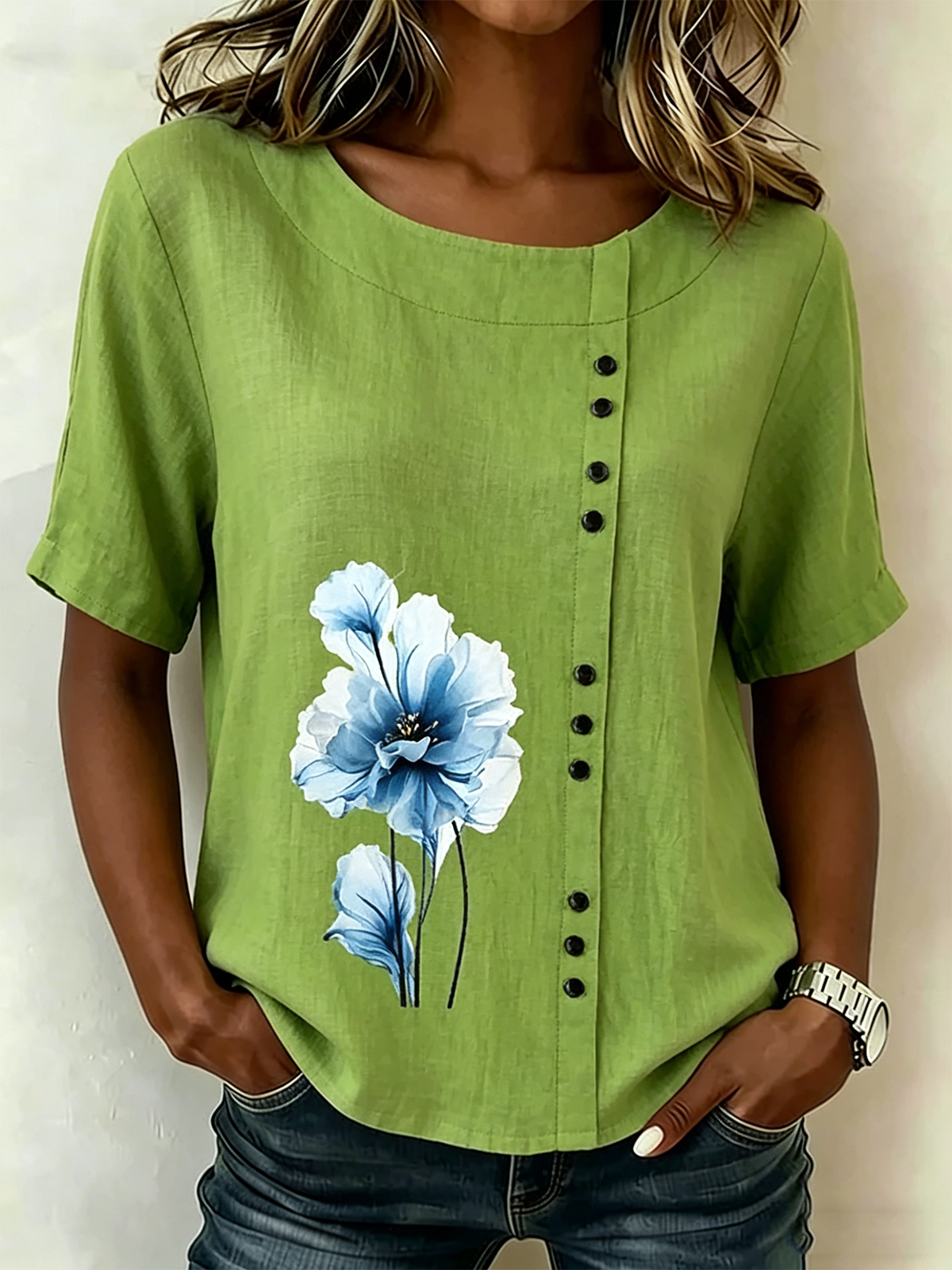 Crew Neck Short Sleeve Floral Regular Loose Shirt For Women