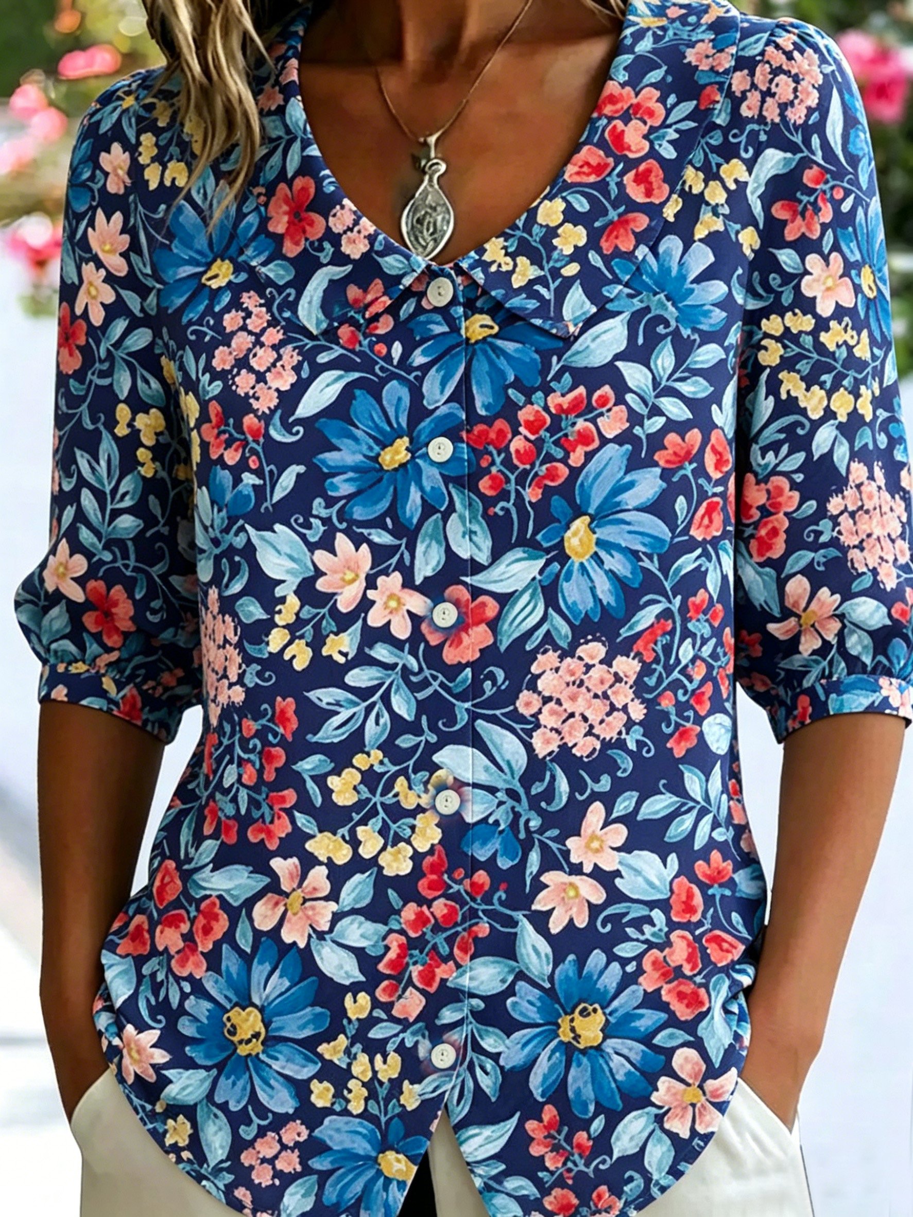 Shawl Collar Half Sleeve Floral Regular Loose Shirt For Women
