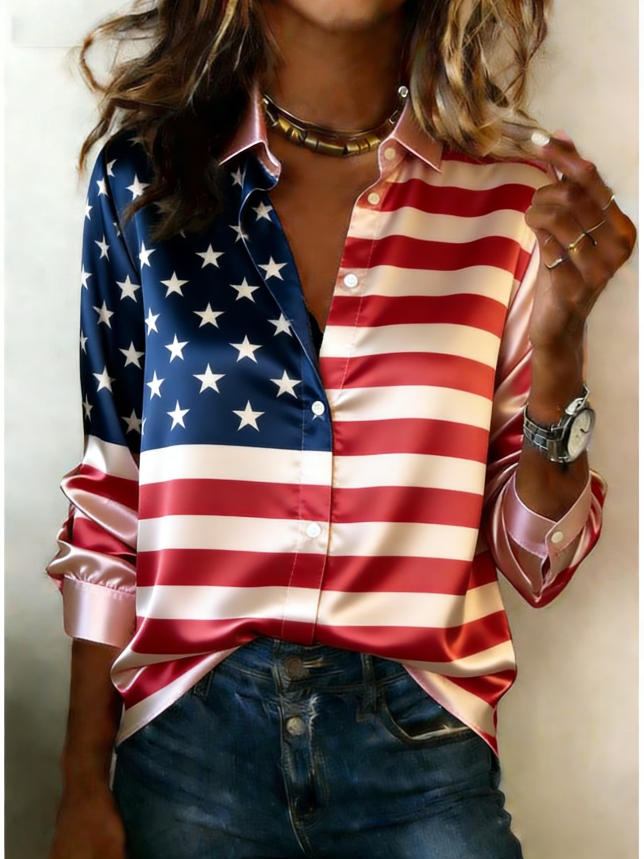 Shawl Collar Long Sleeve America Flag Regular Micro-Elasticity Regular Fit Button Up Shirt Shirt For Women