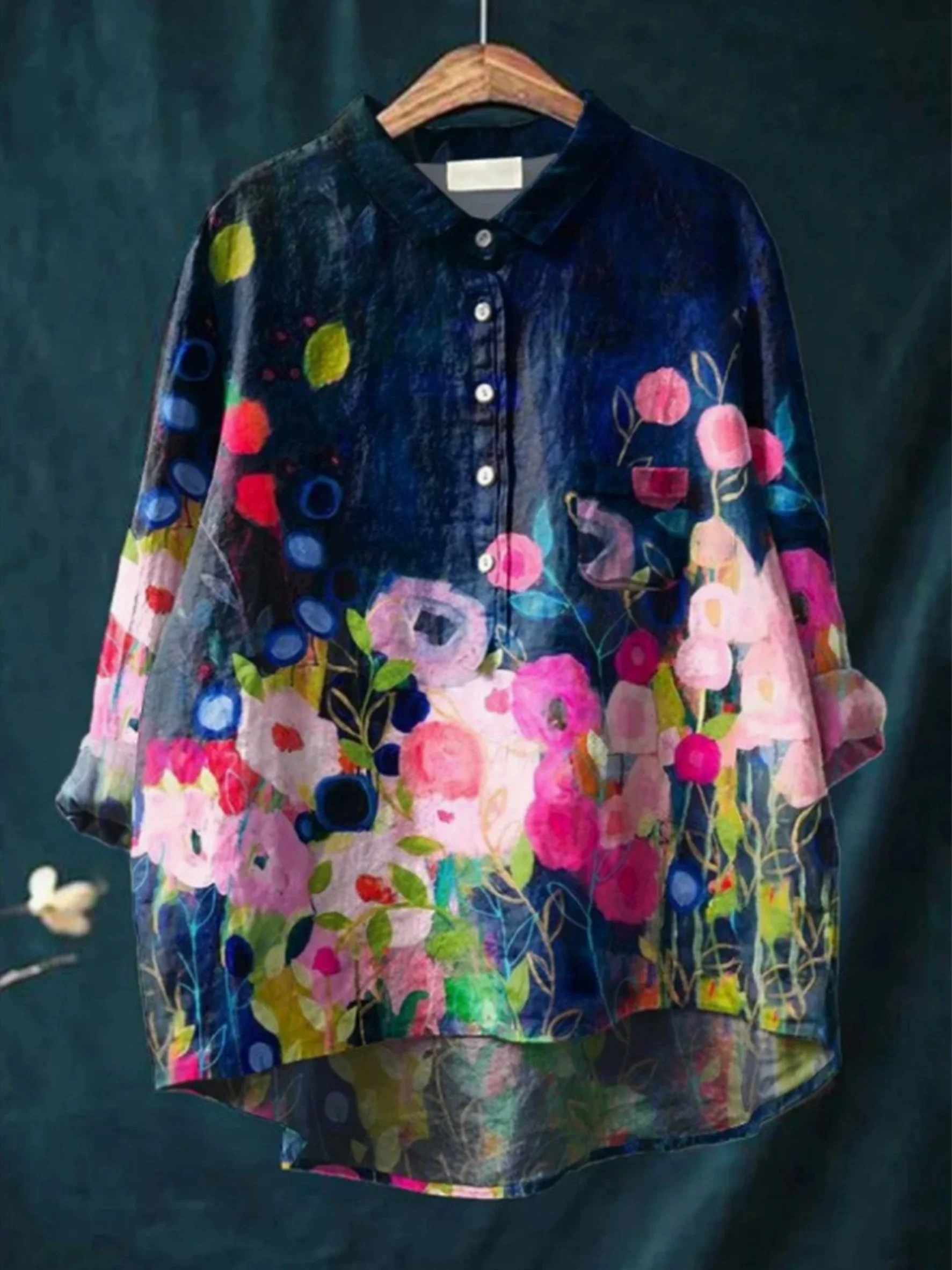 Shawl Collar Long Sleeve Floral Regular Loose Shirt For Women