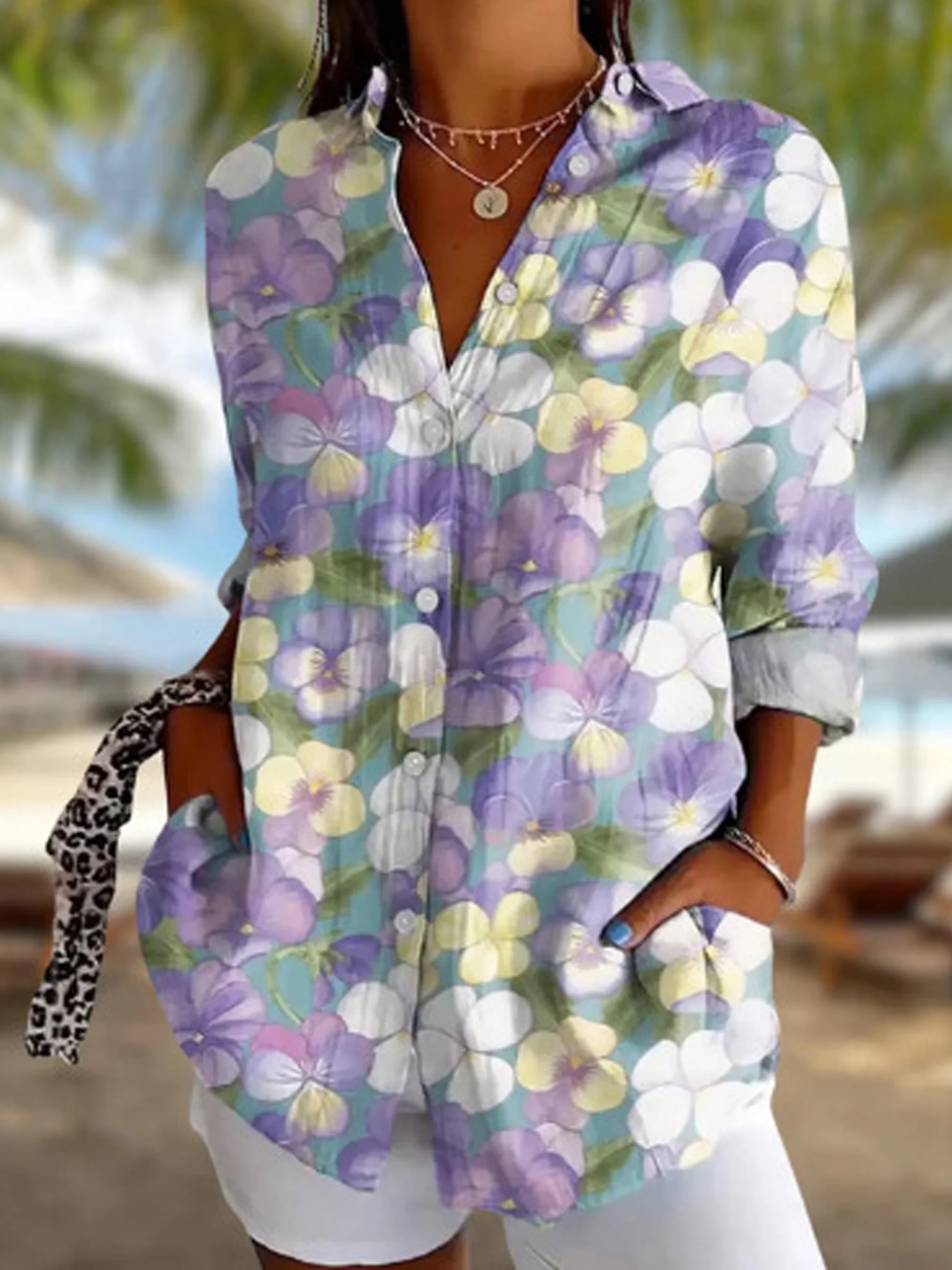 Shawl Collar Long Sleeve Floral Regular Loose Shirt For Women