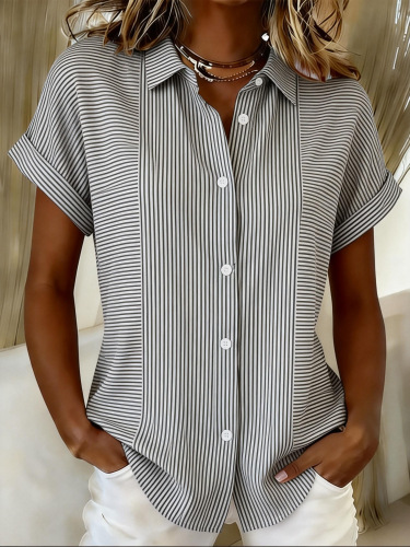 Shawl Collar Short Sleeve Striped Regular Loose Shirt For Women