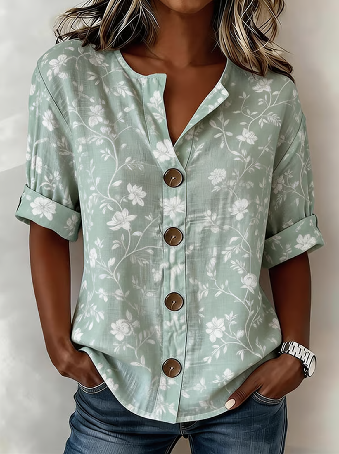 Stand Collar Long Sleeve Floral Regular Loose Shirt For Women