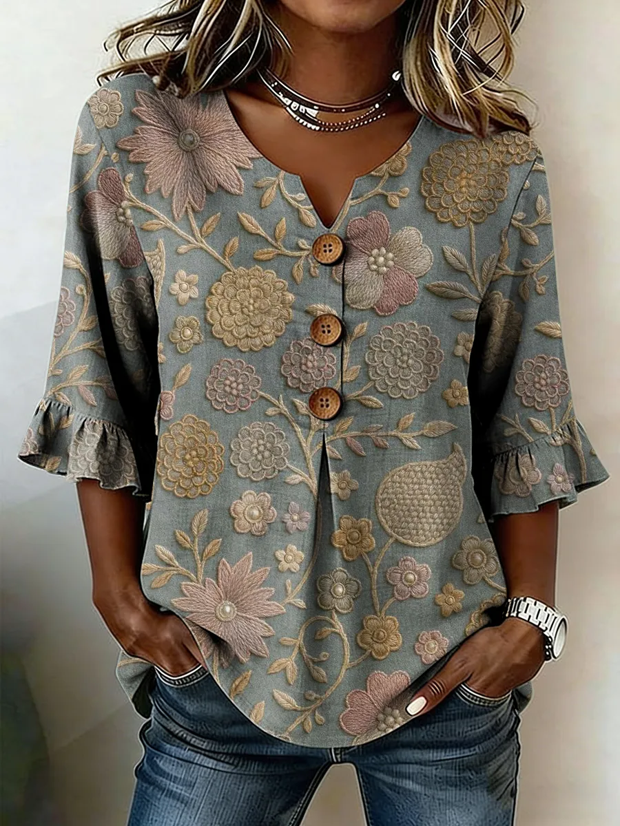 V Neck Half Sleeve Floral Printing Regular Micro-Elasticity Regular Fit Blouse For Women