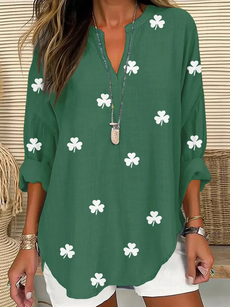 St. Patrick's Day V Neck Long Sleeve Shamrock Regular Loose Shirt For Women