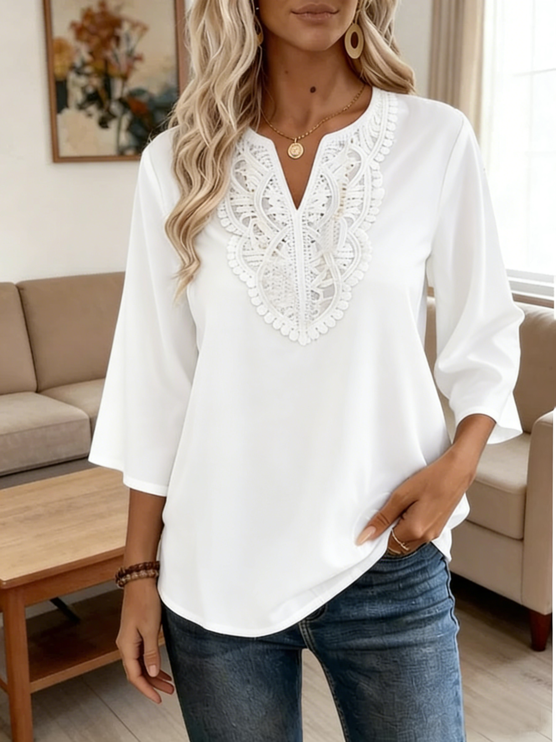 V Neck Three Quarter Sleeve Plain Regular Loose Blouse For Women