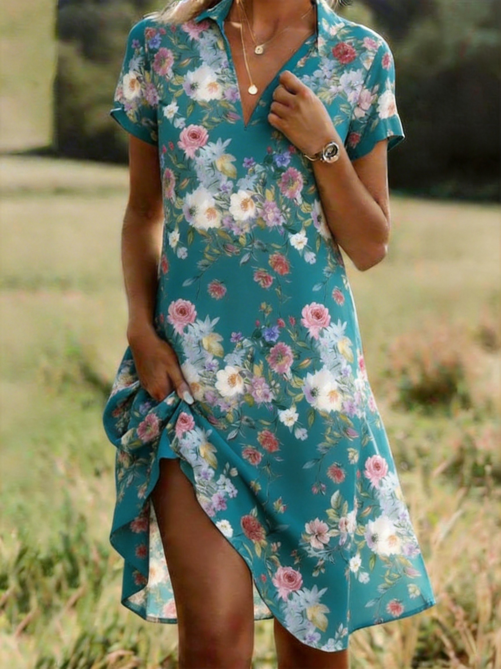 Women Floral All Season Dress Shirt Collar Short Sleeve Shirt Dress A-Line Dress