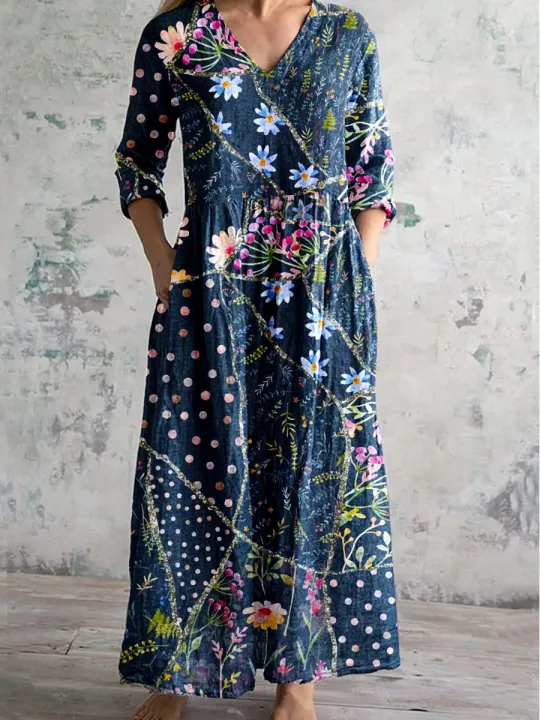 Women Floral Spring/Fall Dress V Neck Long Sleeve T-Shirt Dress A-Line Dress