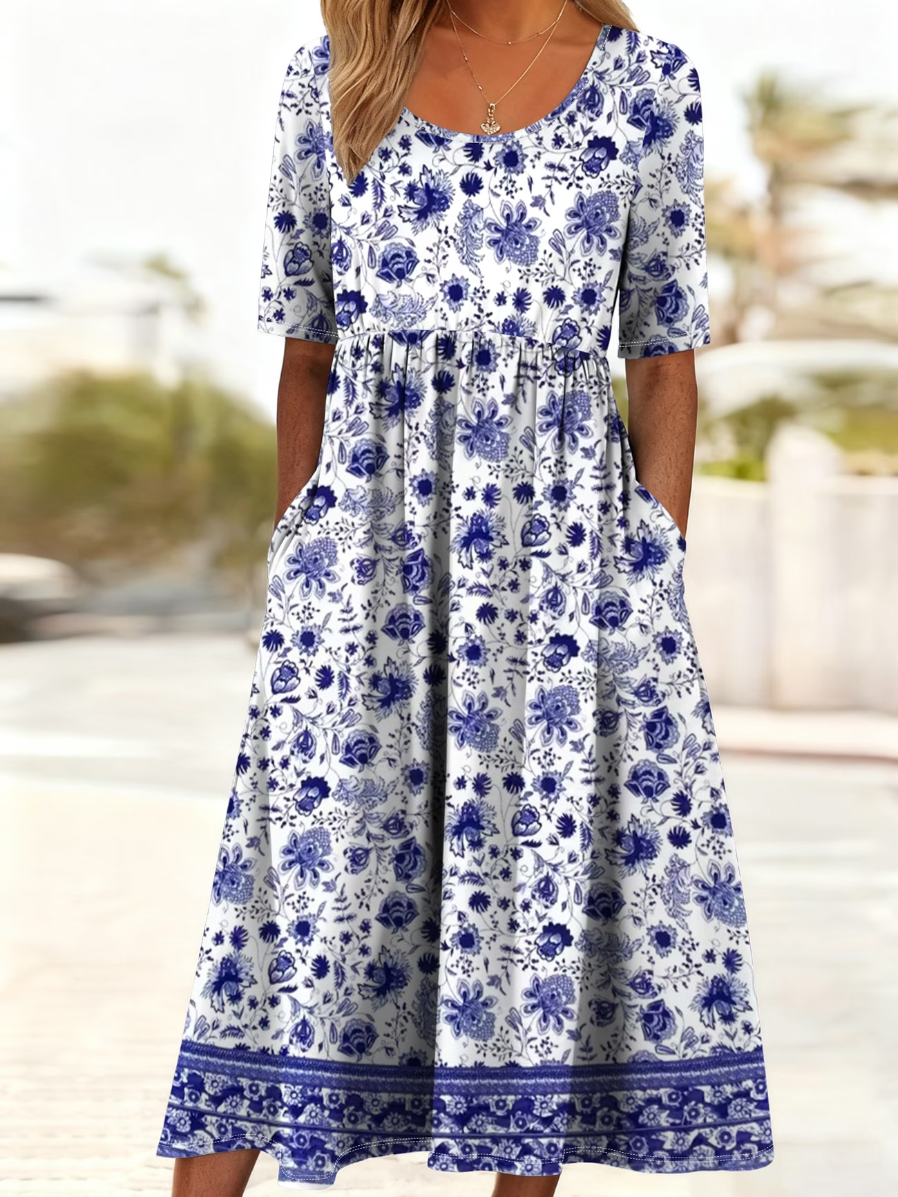 Women Floral Summer Printing Dress Crew Neck Short Sleeve Shift Dress H-Line Dress