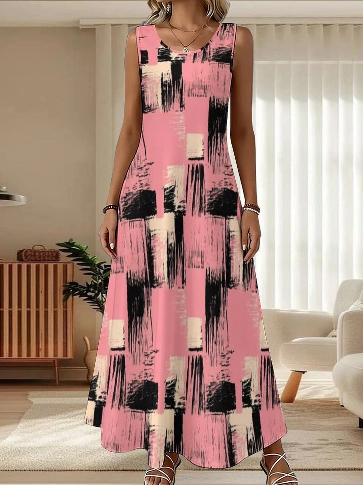 Women Geometric Summer Dress Crew Neck Sleeveless Tank A-Line Dress