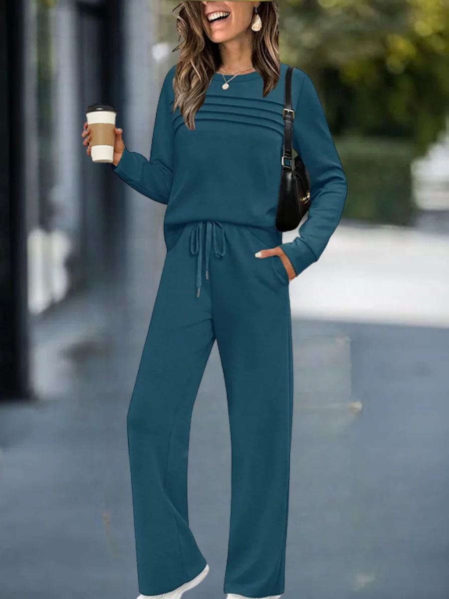 Women Plain Split Joint Two-Piece Set Daily Long Sleeve Casual Spring/Fall Top With Pants Matching Set