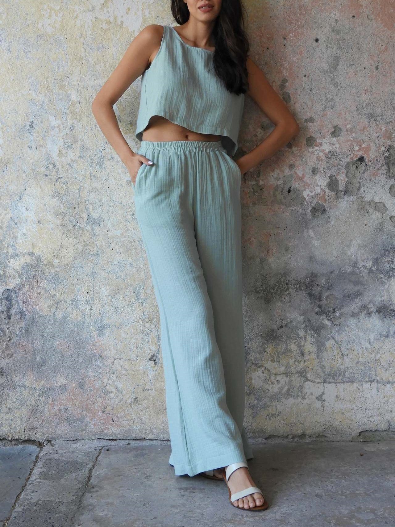 Women Plain Split Joint Two-Piece Set Daily Sleeveless Casual Summer Top With Pants Matching Set