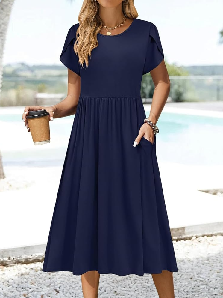 Women Plain Summer Dress Crew Neck Short Sleeve A-Line Dress