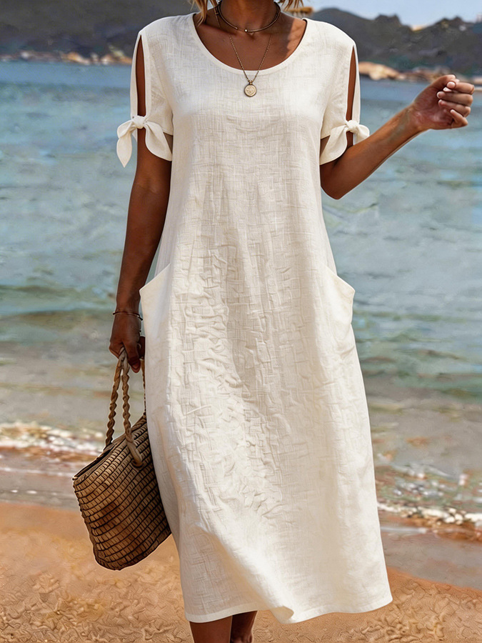 Women Plain Summer Dress Crew Neck Short Sleeve H-Line Dress