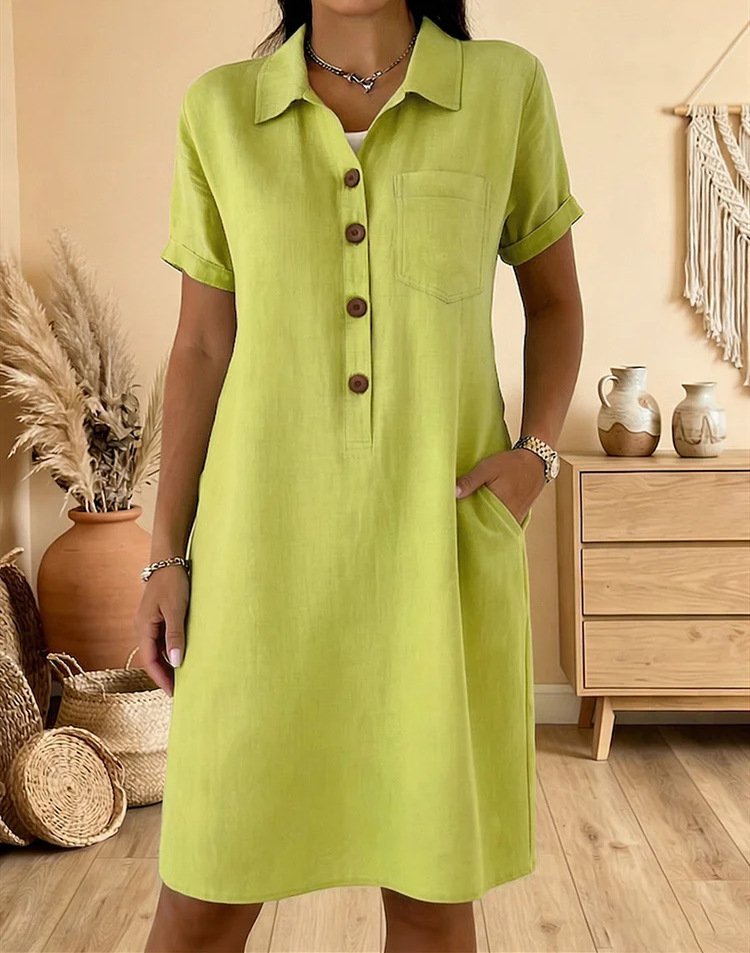 Women Plain Summer Dress Shawl Collar Short Sleeve H-Line Dress