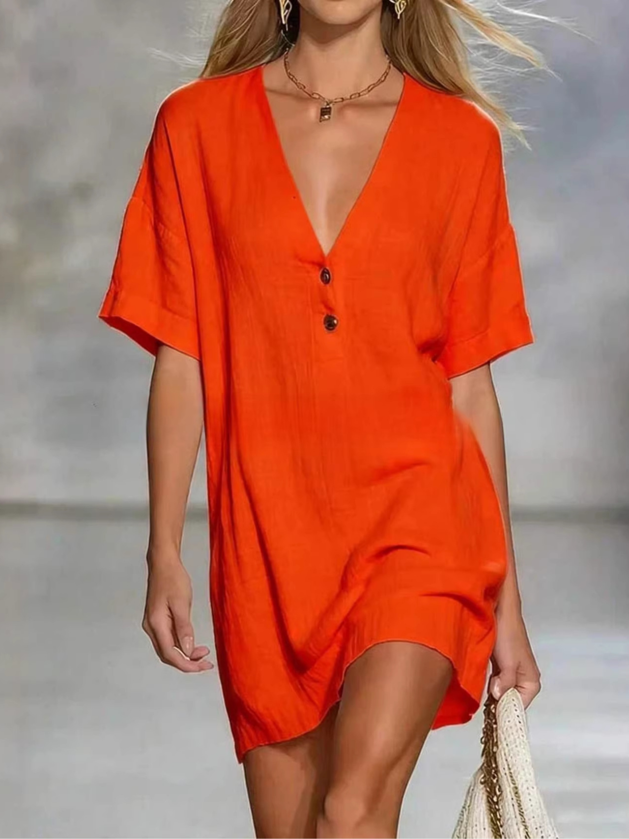 Women Plain Summer Dress V Neck Short Sleeve T-Shirt Dress H-Line Dress