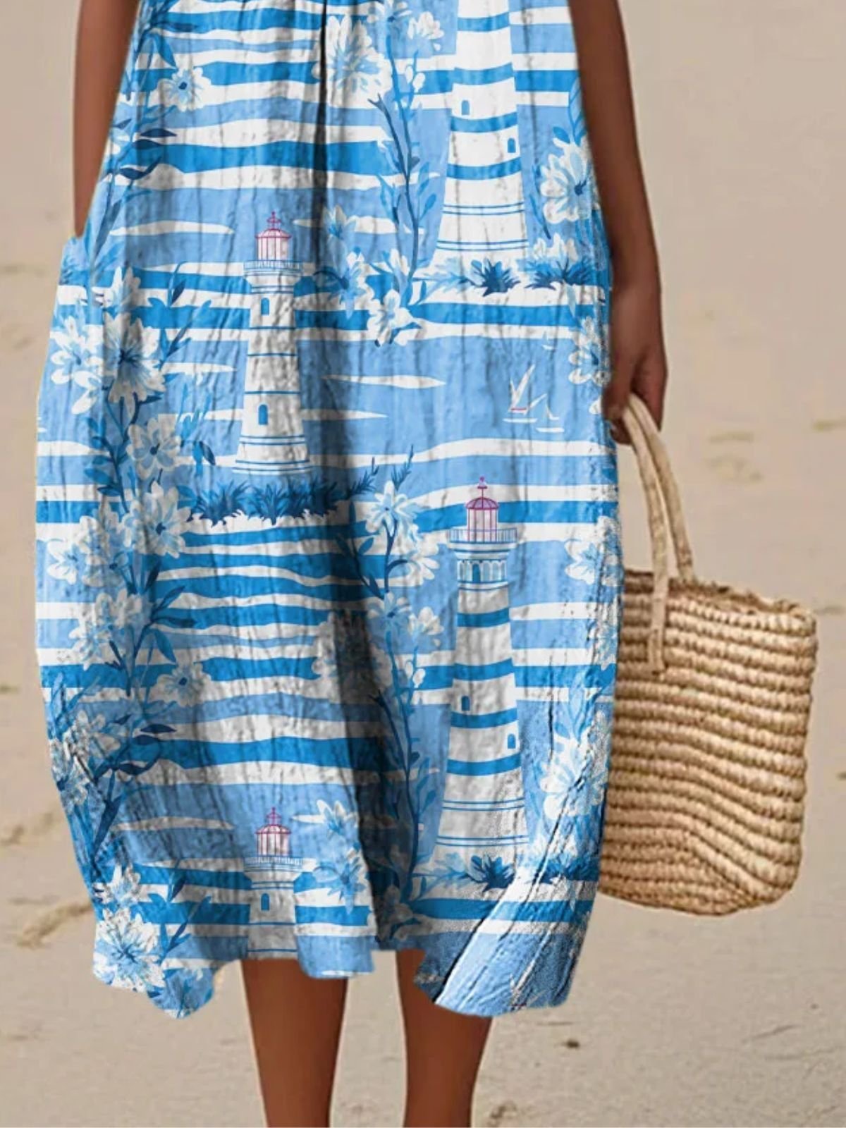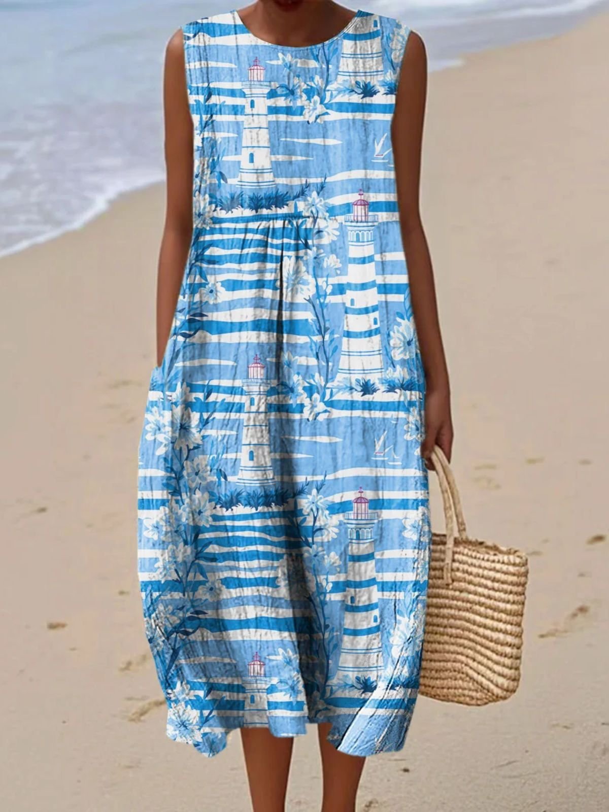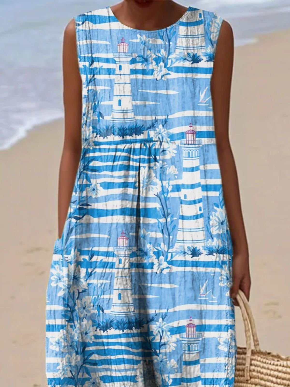 Women Sea Summer Dress Crew Neck Sleeveless A-Line Dress