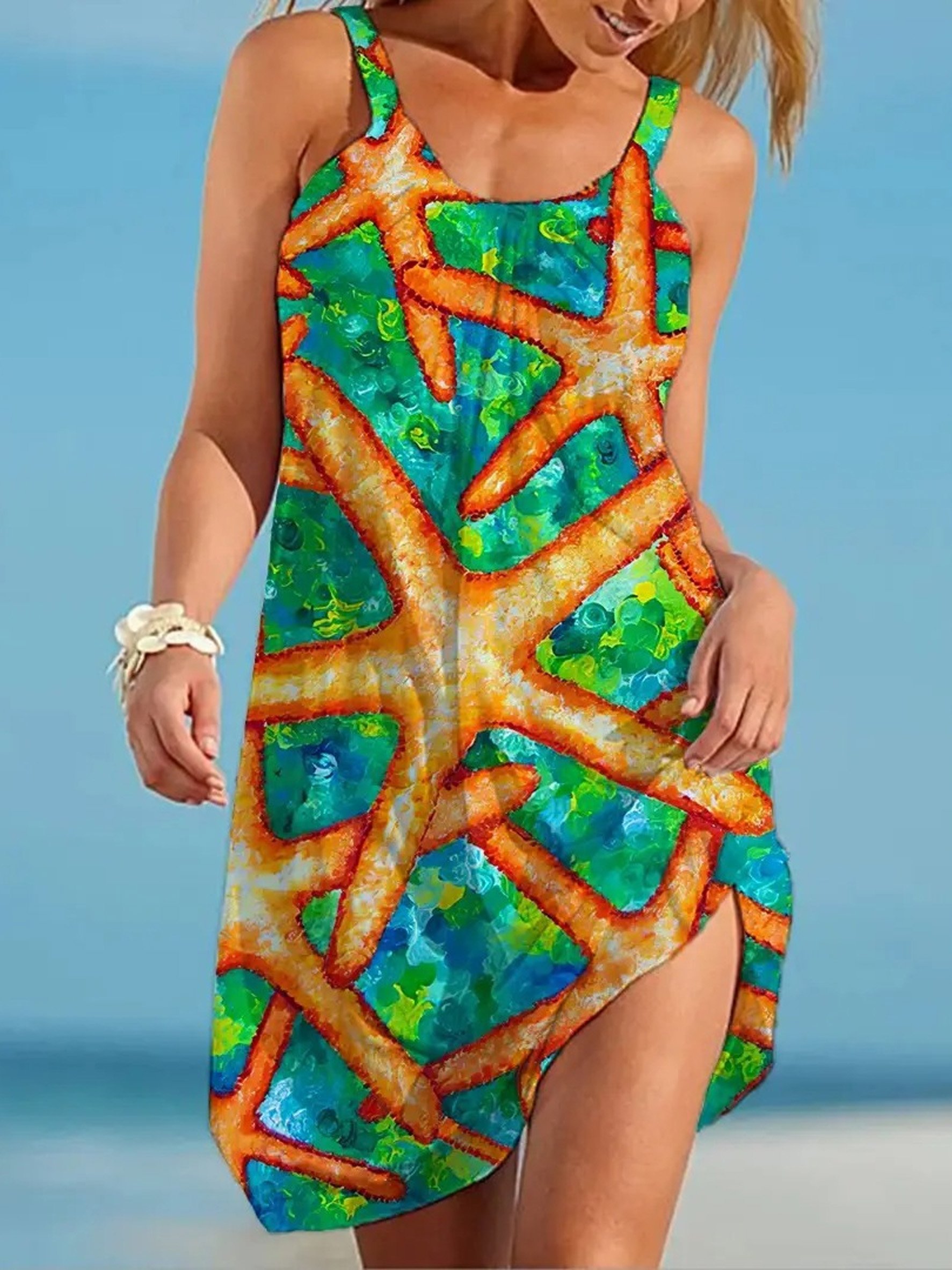 Women Starfish Summer Dress Crew Neck Sleeveless Fit & Flare Dress A-Line Dress