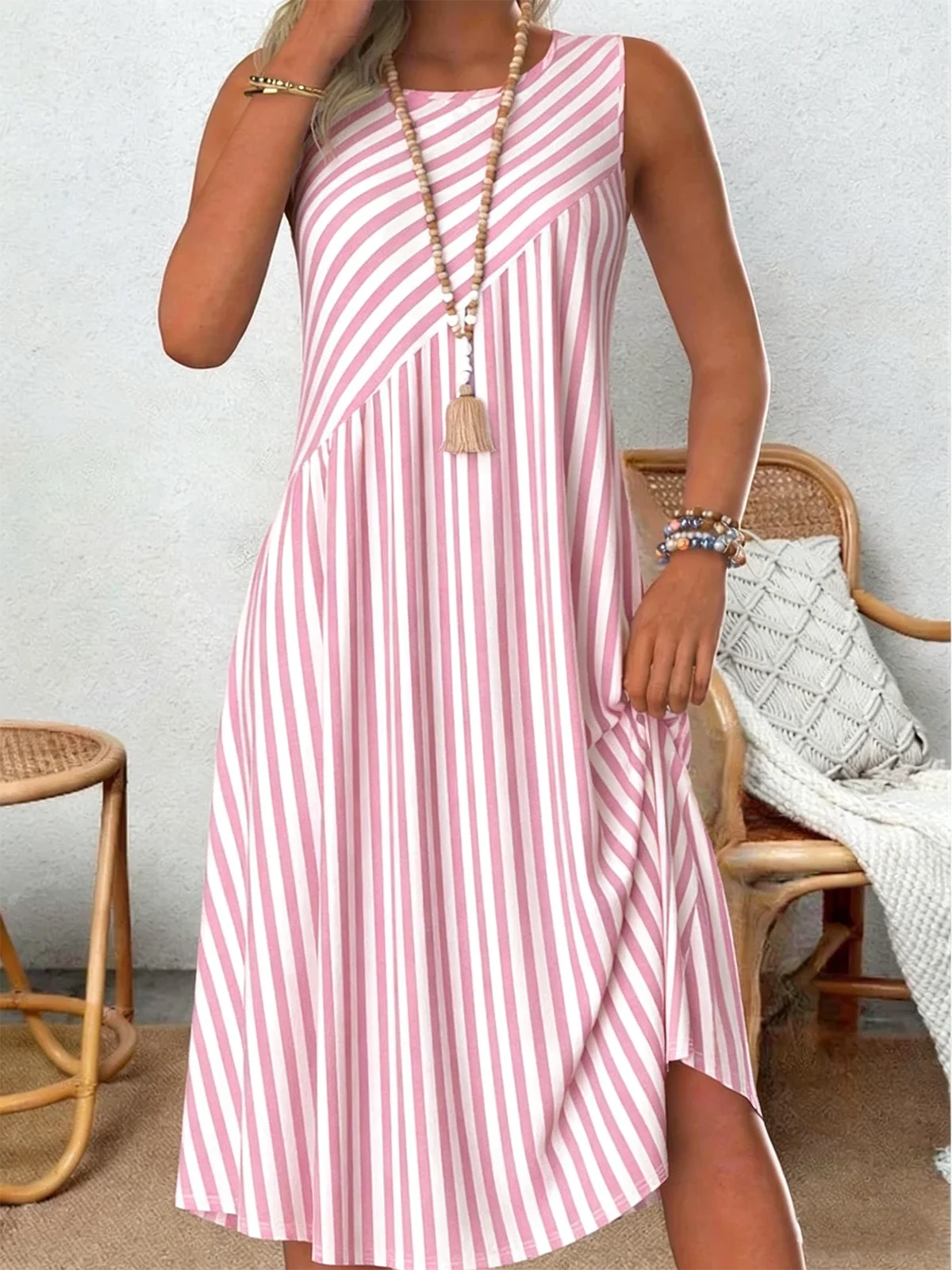 Women Striped Crew Neck Sleeveless Comfy Casual Midi Dress