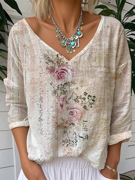 Vintage 3D Floral Printing V Neck Long Sleeve T-shirt