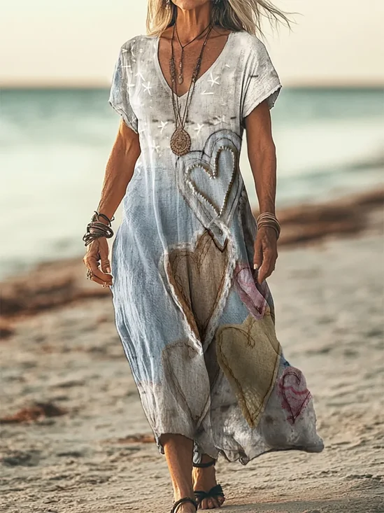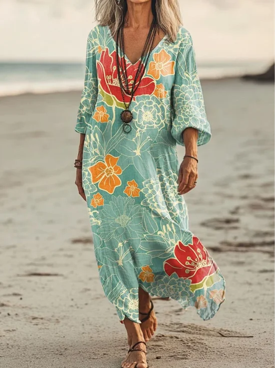 Women Abstract Summer Printing Dress V Neck Long Sleeve Tunic A-Line Dress