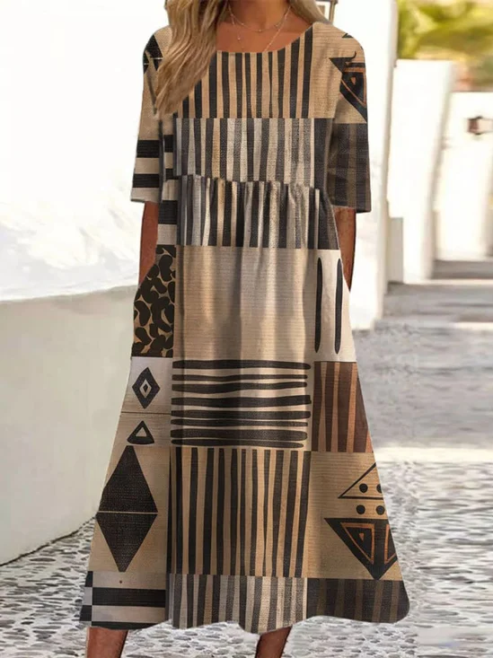 Women Striped Summer Dress V Neck Three Quarter Sleeve X-Line Dress