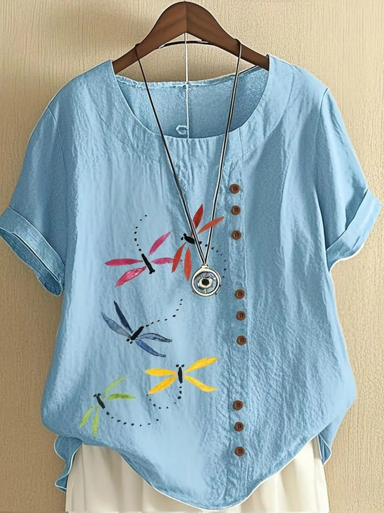 Crew Neck Long Sleeve Plain Buttoned Regular Loose Shirt For Women