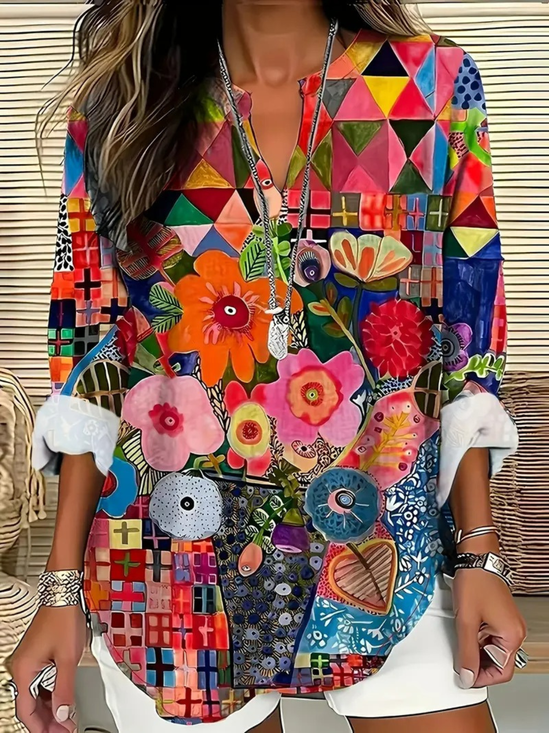 Shirt Collar Long Sleeve Geometric Regular Loose Shirt For Women