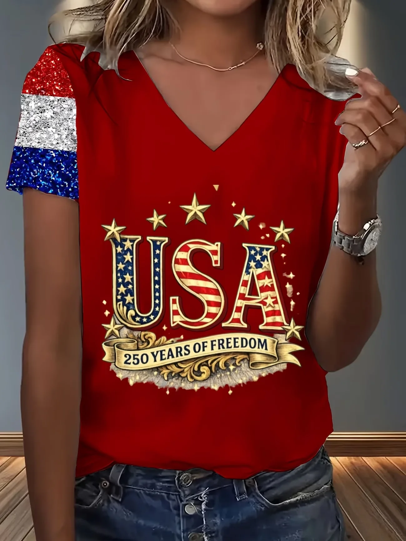 Casual 250 Years of Freedom Anniversary Printing V Neck Short Sleeve T-shirt