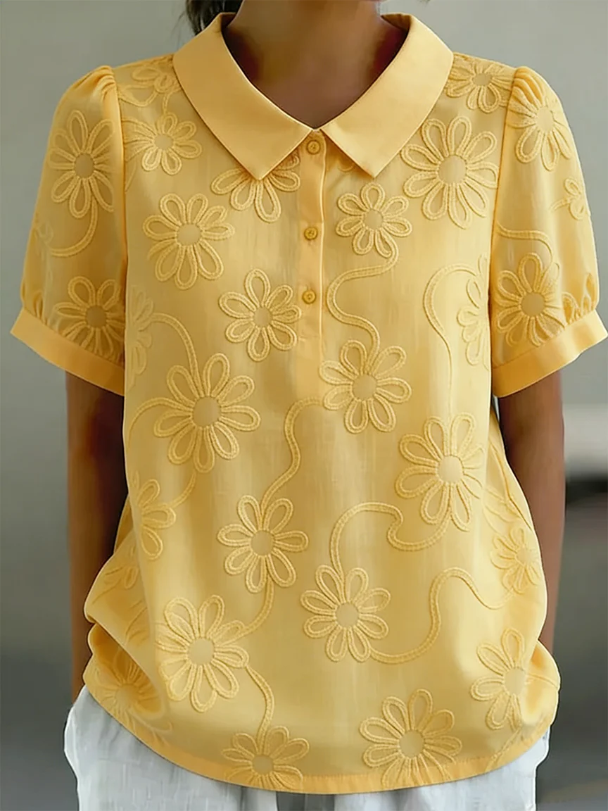 Shawl Collar Short Sleeve Floral Regular Loose Shirt For Women