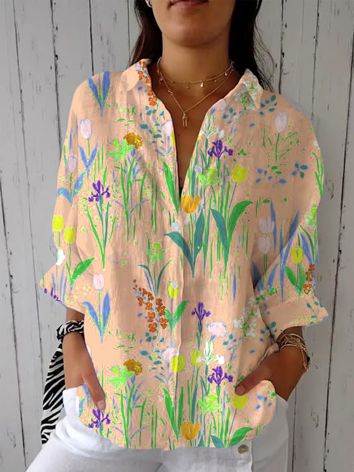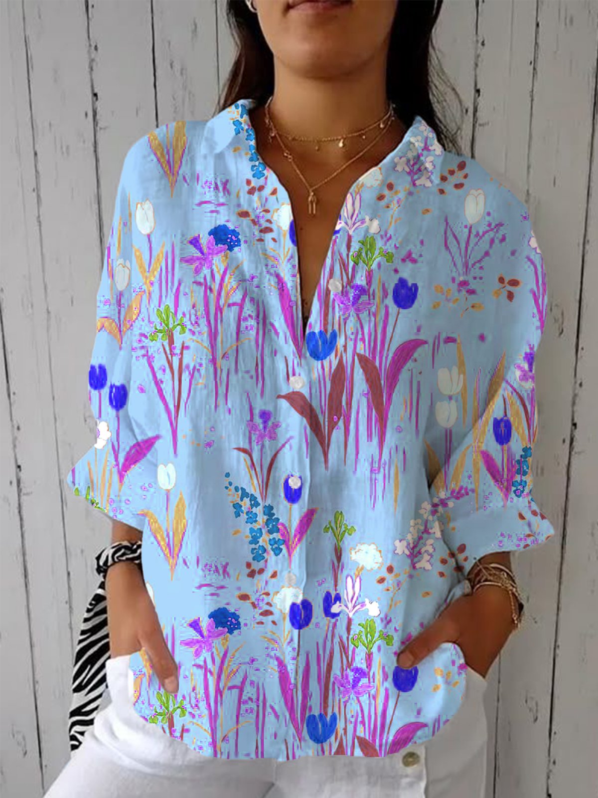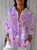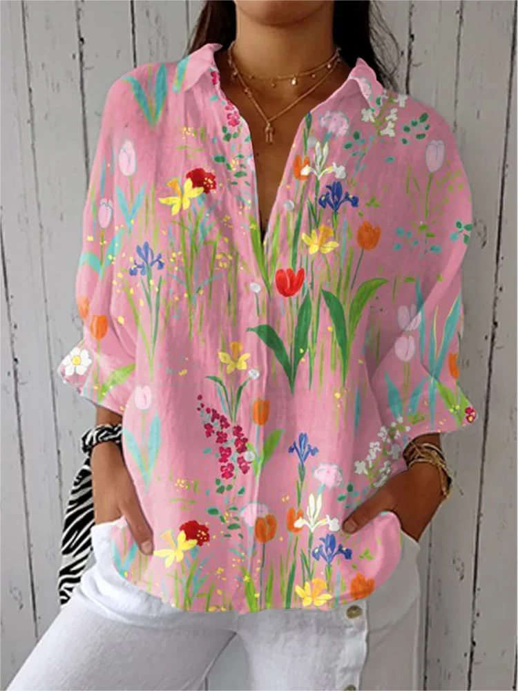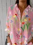 Shirt Collar Three Quarter Sleeve Floral Regular Loose Shirt For Women