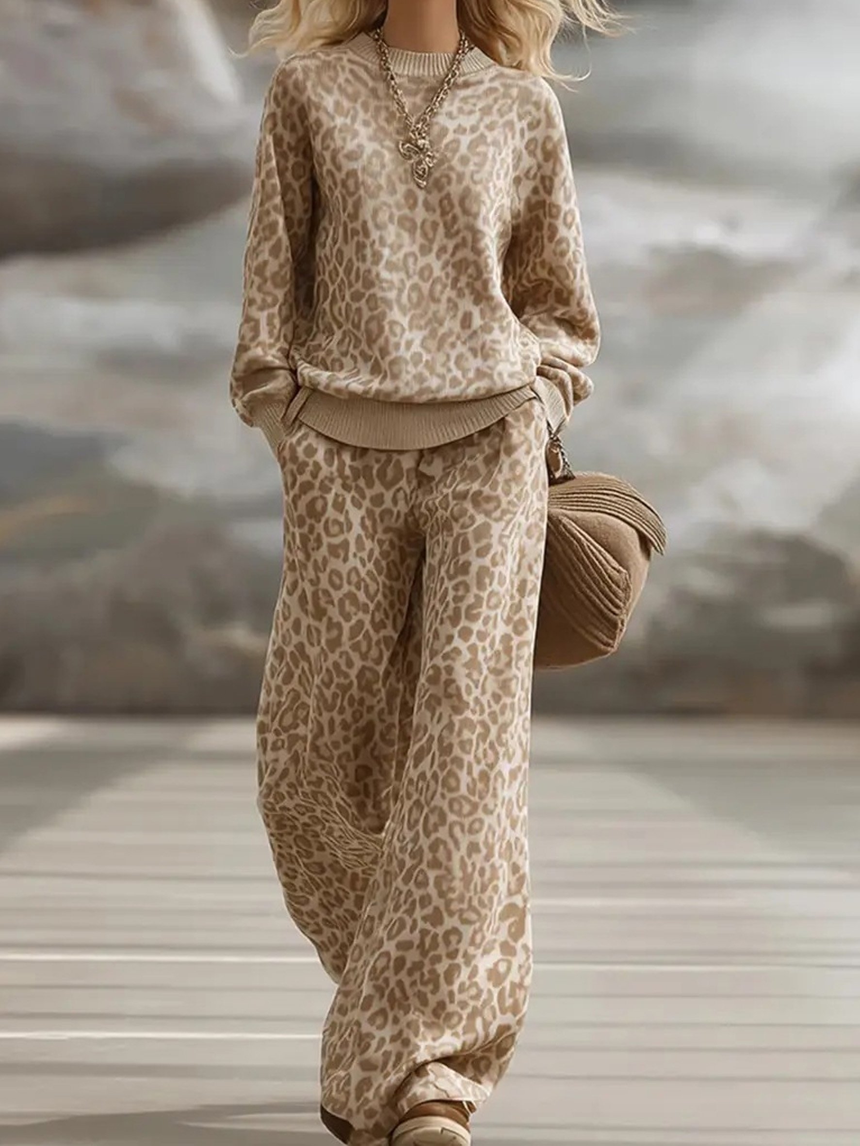 Women Leopard Two-Piece Set Daily Long Sleeve Casual Spring/Fall Top With Pants Matching Set
