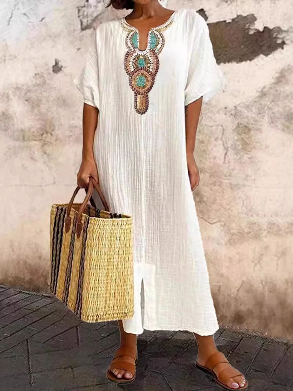 Women Nationality/ethnic Raglan Sleeves Summer Embroidery Dress U-Neck Short Sleeve H-Line Dress
